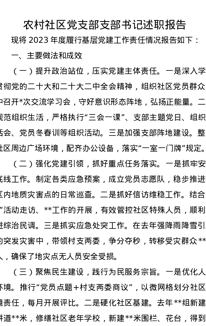 农村社区党支部支部书记述职报告