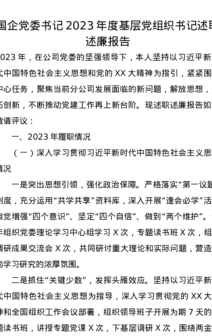 国企党委书记2023年度基层党组织书记述职述廉报告