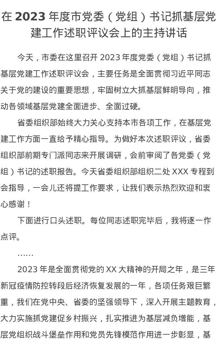 在2023年度市党委(党组)书记抓基层党建工作述职评议会上的主持讲话