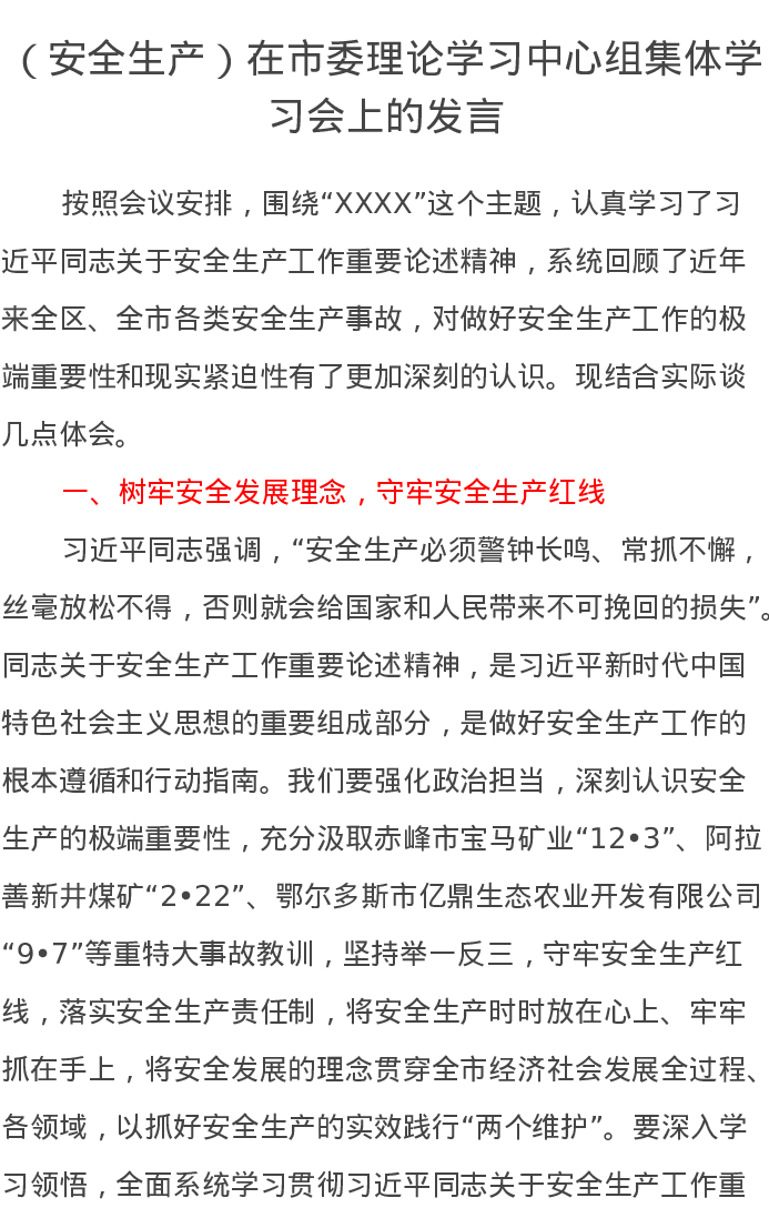 (安全生产)在市委理论学习中心组集体学习会上的发言