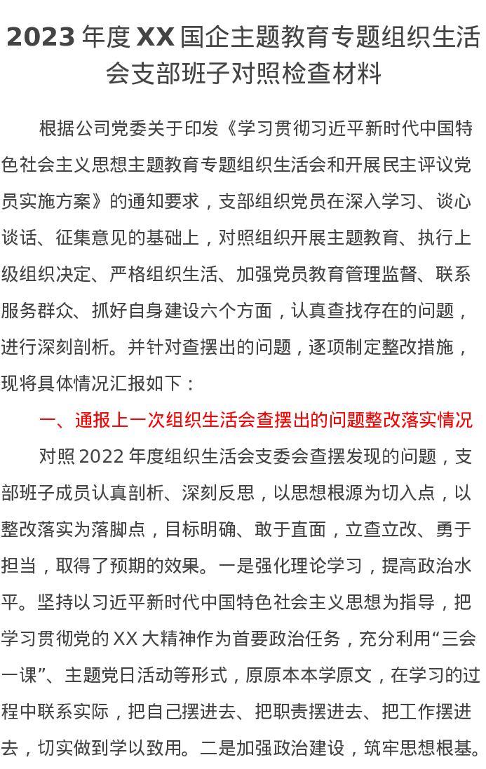 2023年度XX国企第二批主题教育专题组织生活会支部班子对照检查材料(主题教育、执行上级组织决定、严格组织生活、加强党员教育、联系服务群众、抓好自身建设)