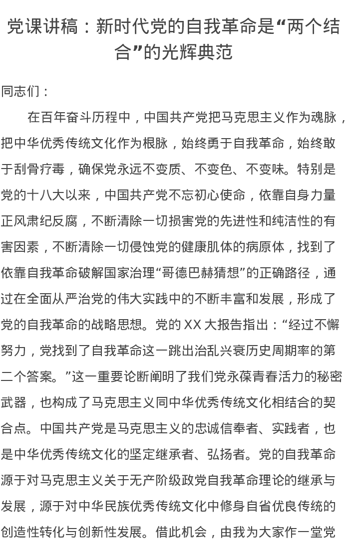党课讲稿:新时代党的自我革命是“两个结合”的光辉典范