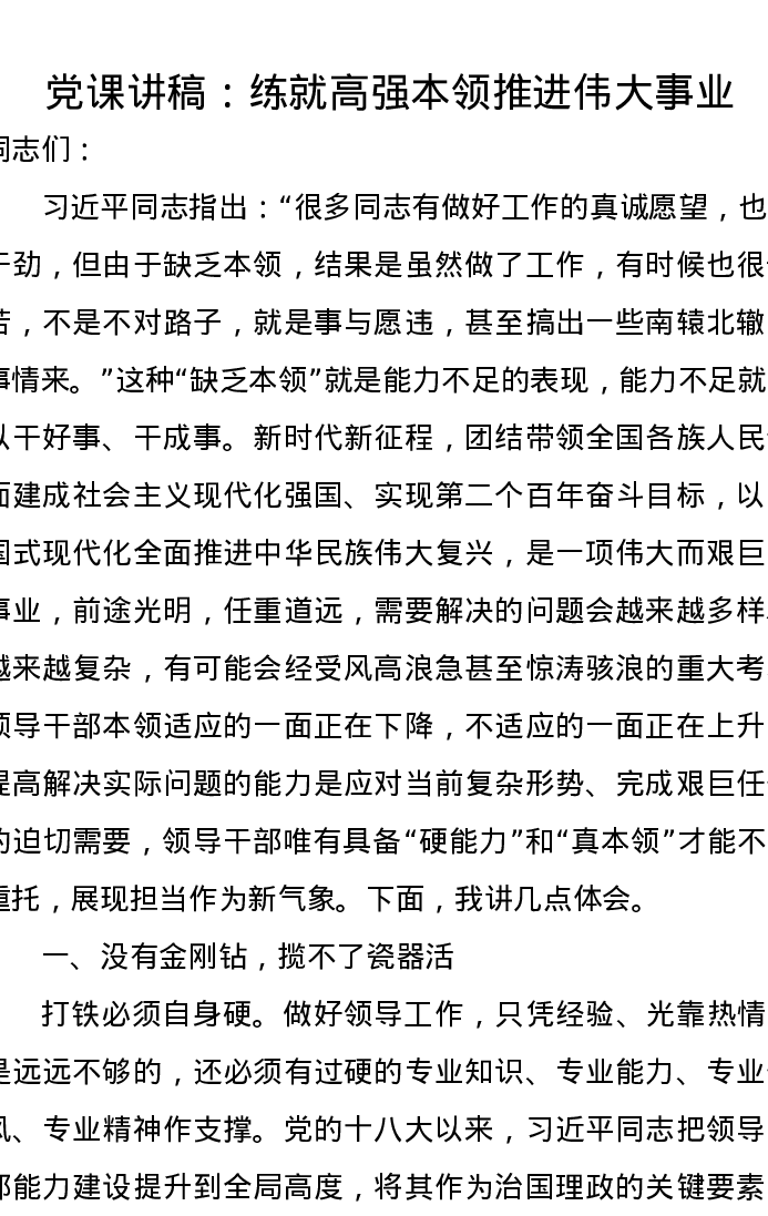 党课讲稿:练就高强本领推进伟大事业