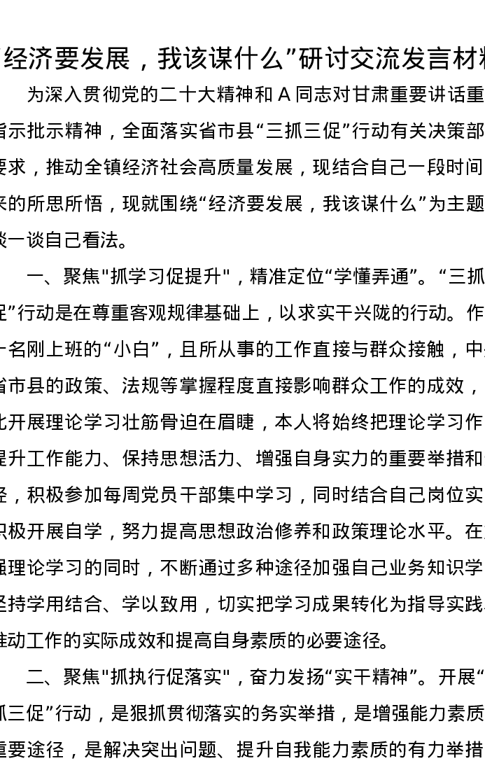 “经济要发展,我该谋什么”研讨交流发言材料