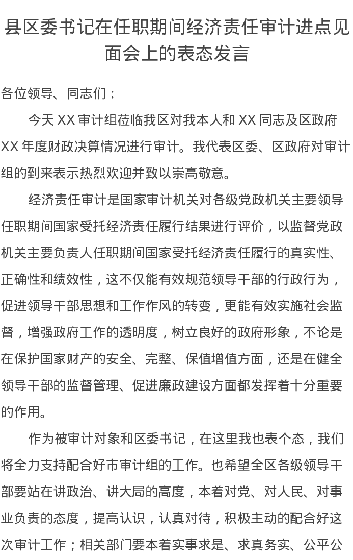 县区委书记在任职期间经济责任审计进点见面会上的表态发言