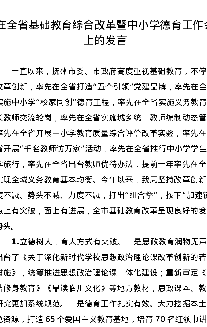在全省基础教育综合改革暨中小学德育工作会上的发言