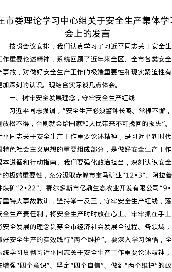 在市委理论学习中心组关于安全生产集体学习会上的发言