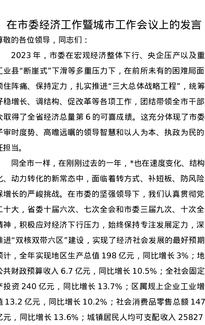 在市委经济工作暨城市工作会议上的发言