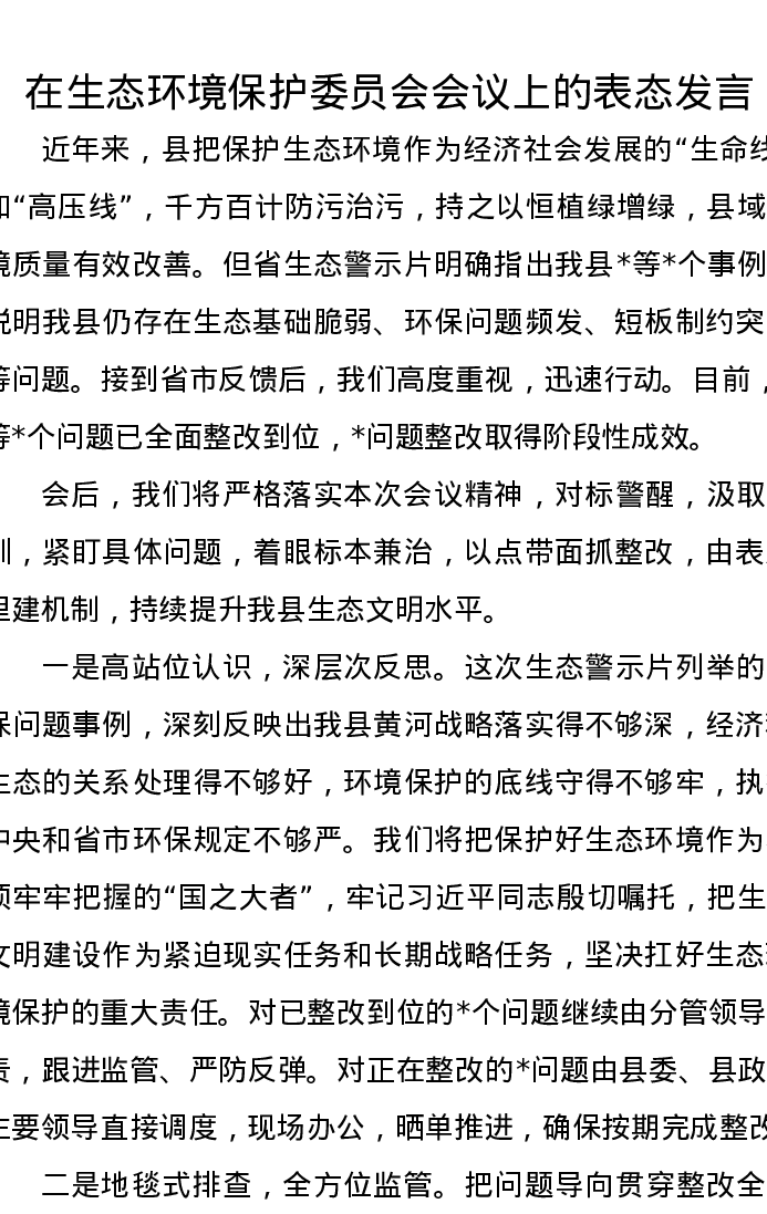 在生态环境保护委员会会议上的表态发言