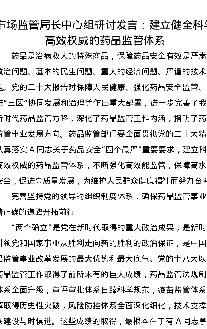 市场监管局长中心组研讨发言:建立健全科学高效权威的药品监管体系