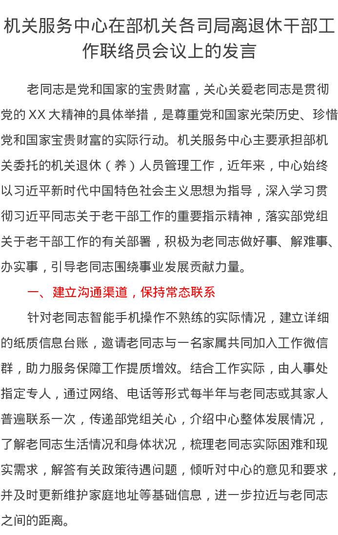 机关服务中心在部机关各司局离退休干部工作联络员会议上的发言