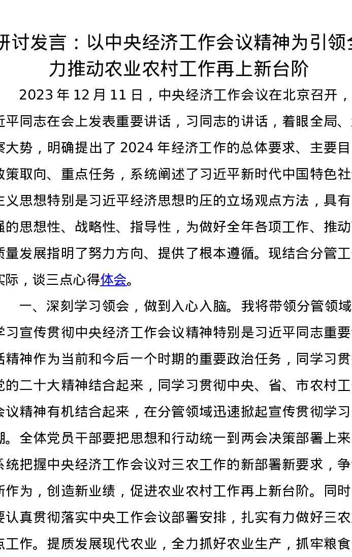 研讨发言:以中央经济工作会议精神为引领全力推动农业农村工作再上新台阶