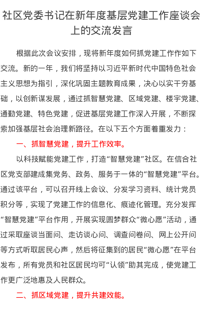 社区党委书记在新年度基层党建工作座谈会上的交流发言