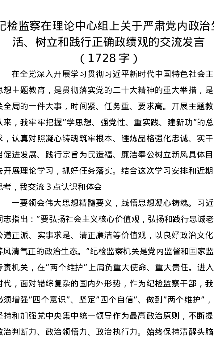 纪检监察在理论中心组上关于严肃党内政治生活、树立和践行正确政绩观的交流发言