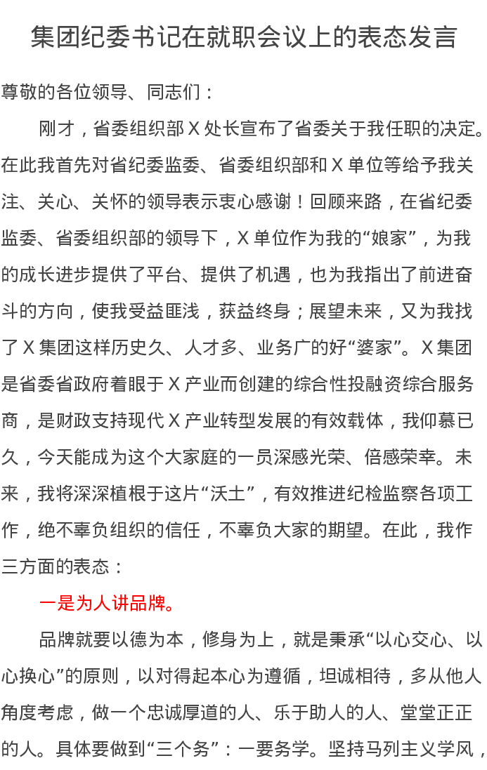 集团纪委书记在就职会议上的表态发言