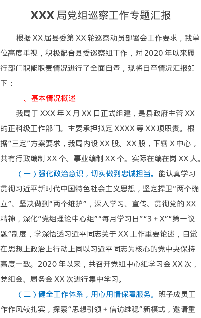 XXX局党组巡察工作专题汇报
