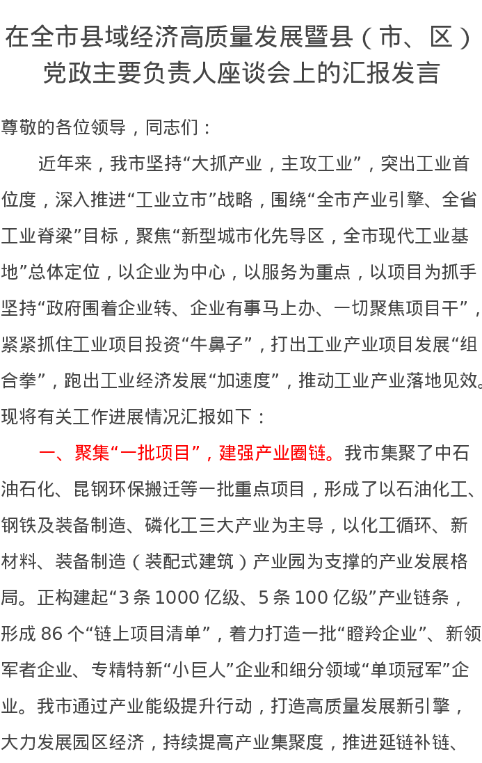 在全市县域经济高质量发展暨县(市、区)党政主要负责人座谈会上的汇报发言