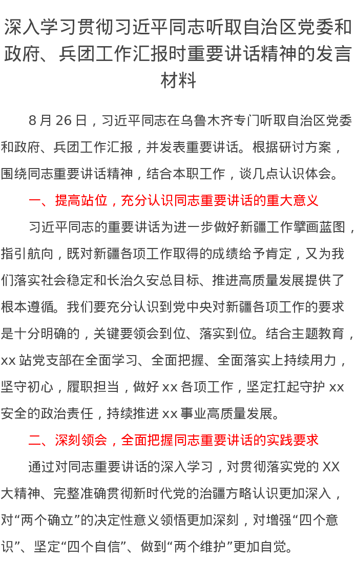 深入学习贯彻习近平总书记听取自治区党委和政府、兵团工作汇报时重要讲话精神的发言材料