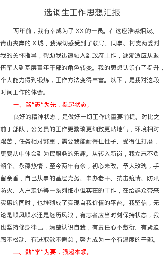 选调生工作思想汇报
