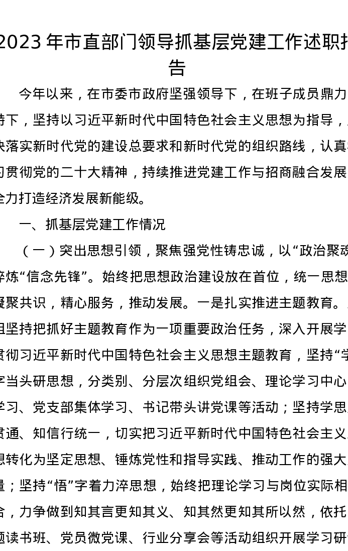 2023年市直部门领导抓基层党建工作述职报告