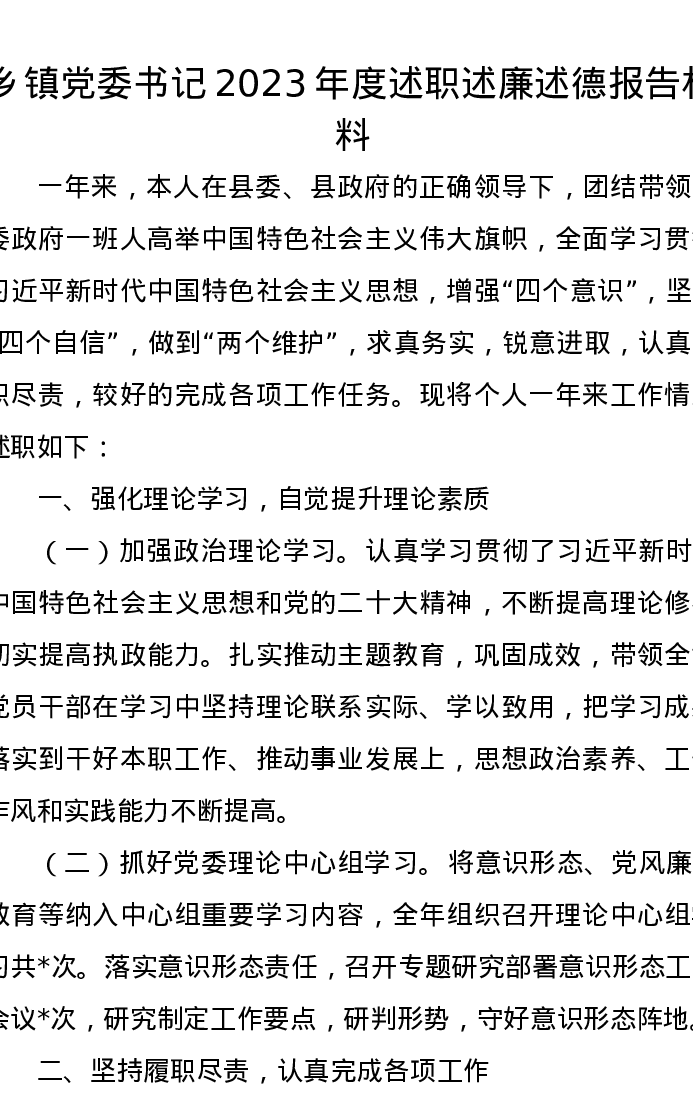 乡镇党委书记2023年度述职述廉述德报告材料