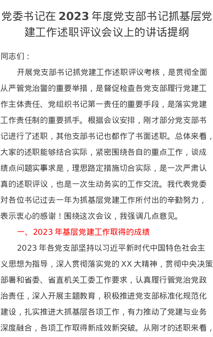党委书记在2023年度党支部书记抓基层党建工作述职评议会议上的讲话提纲