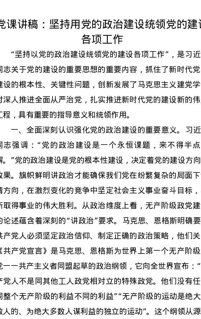 党课讲稿:坚持用党的政治建设统领党的建设各项工作