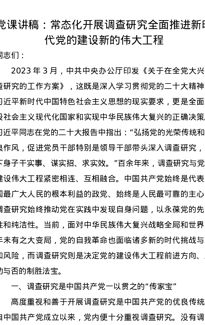 党课讲稿:常态化开展调查研究全面推进新时代党的建设新的伟大工程