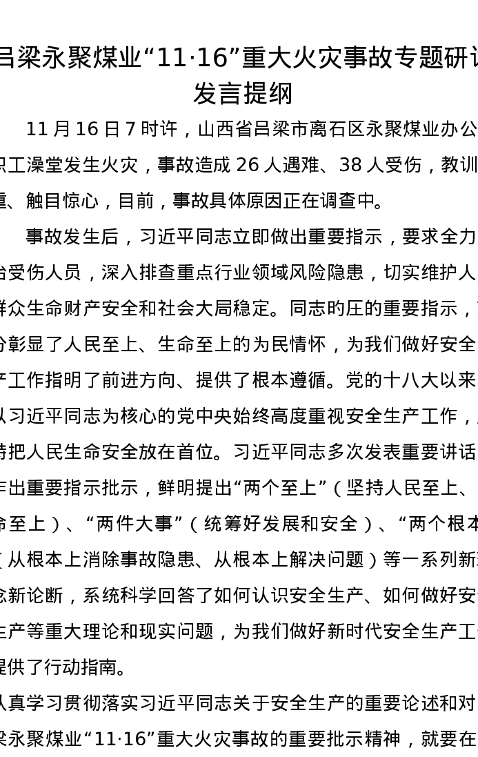 吕梁永聚煤业“11·16”重大火灾事故专题研讨发言提纲