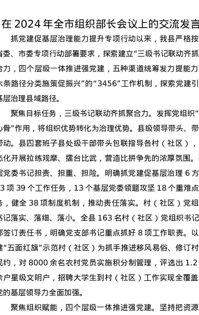 在2024年全市组织部长会议上(抓党建促基层治理能力提升)的交流发言