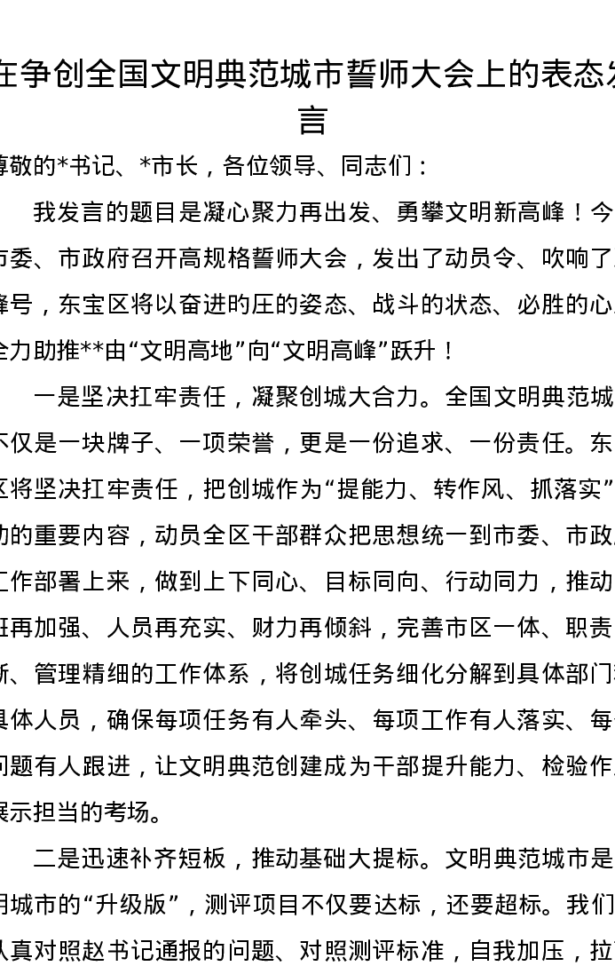 在争创全国文明典范城市誓师大会上的表态发言