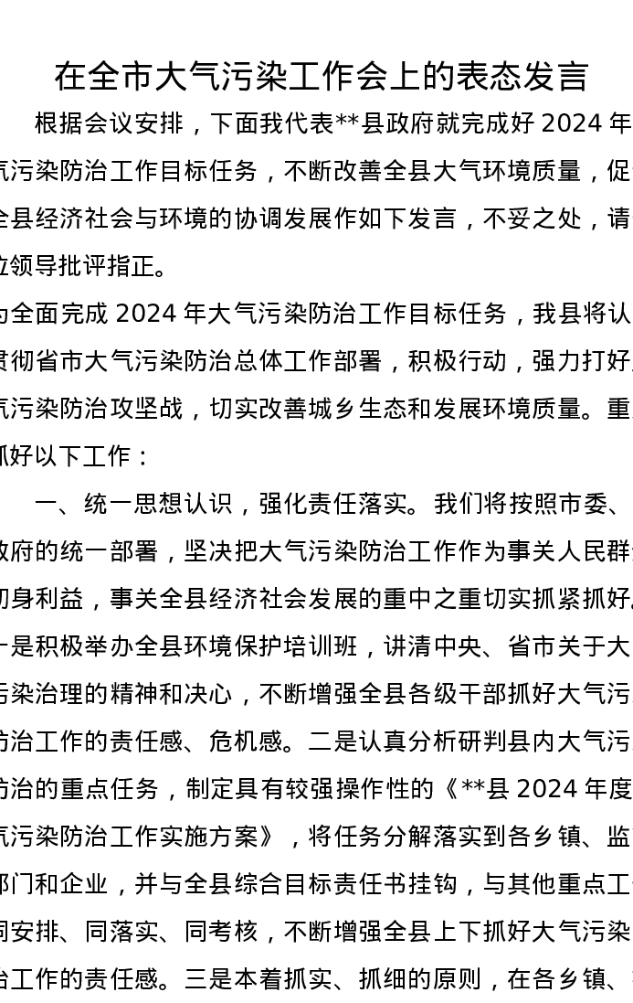 在全市大气污染工作会上的表态发言