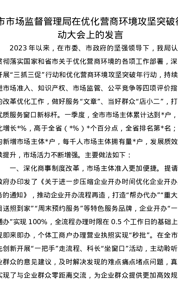 市市场监督管理局在优化营商环境攻坚突破行动大会上的发言