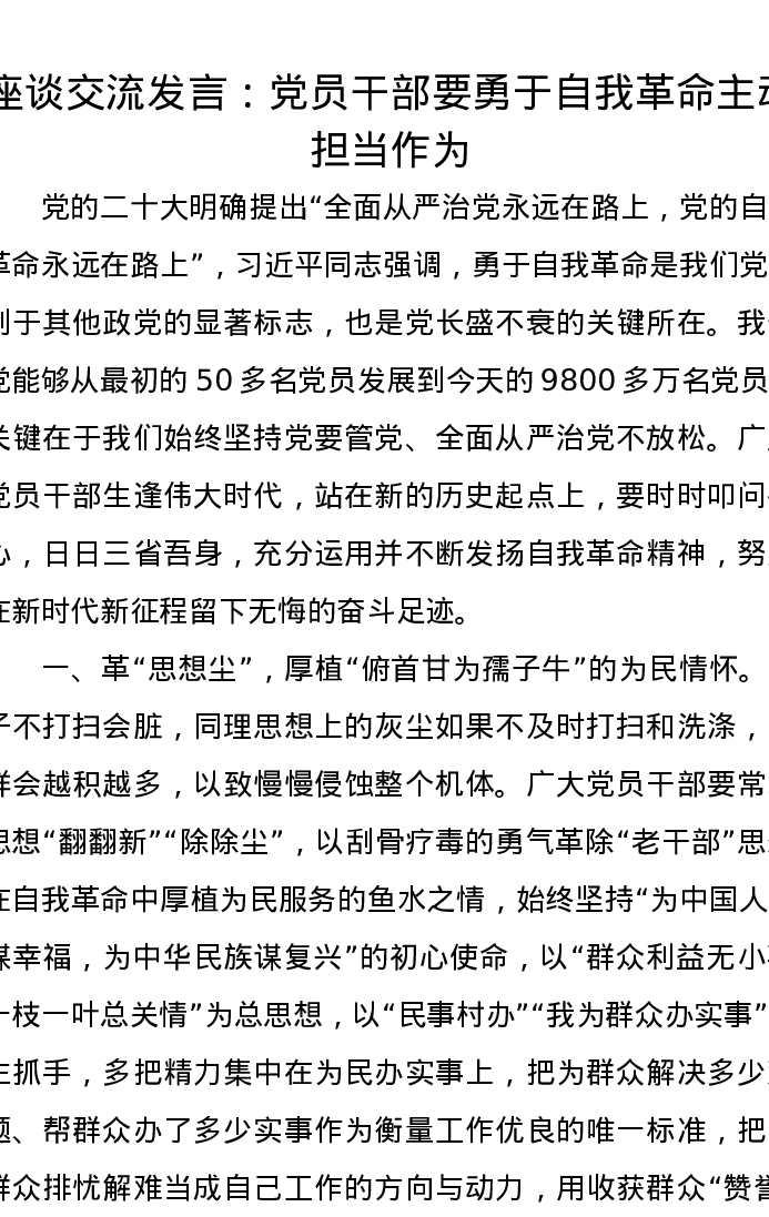 座谈交流发言:党员干部要勇于自我革命主动担当作为