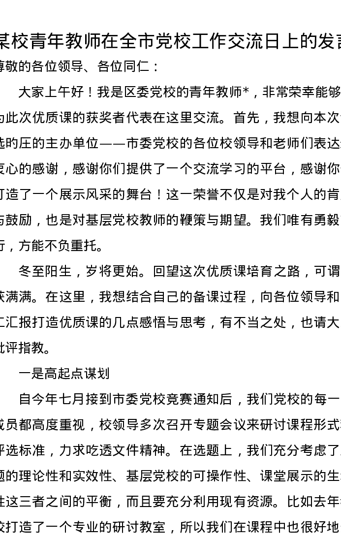 某校青年教师在全市党校工作交流日上的发言