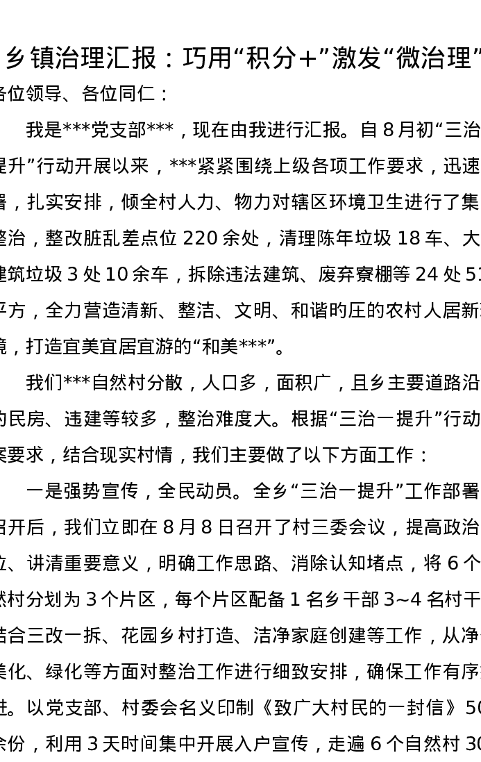 乡镇治理汇报:巧用“积分+”激发“微治理”