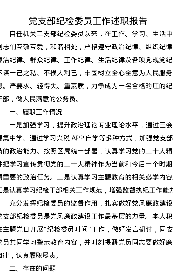 党支部纪检委员工作述职报告