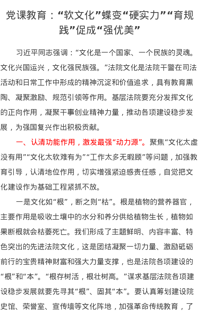 党课讲稿:“软文化”蝶变“硬实力”“育规践”促成“强优美”