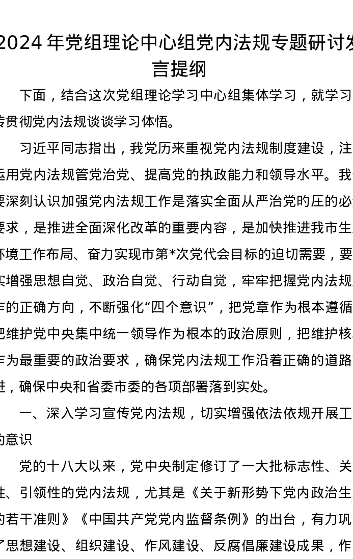 2024年党组理论中心组党内法规专题研讨发言提纲