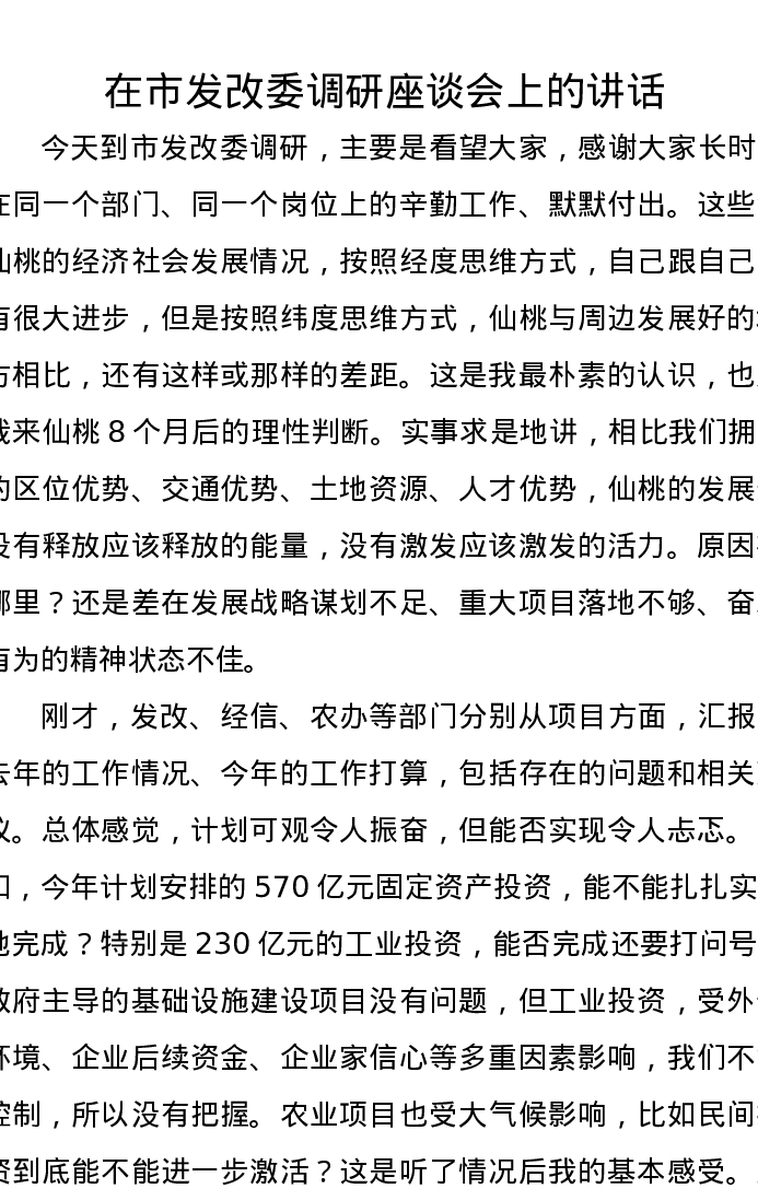 优选讲话:在市发改委调研座谈会上的讲话