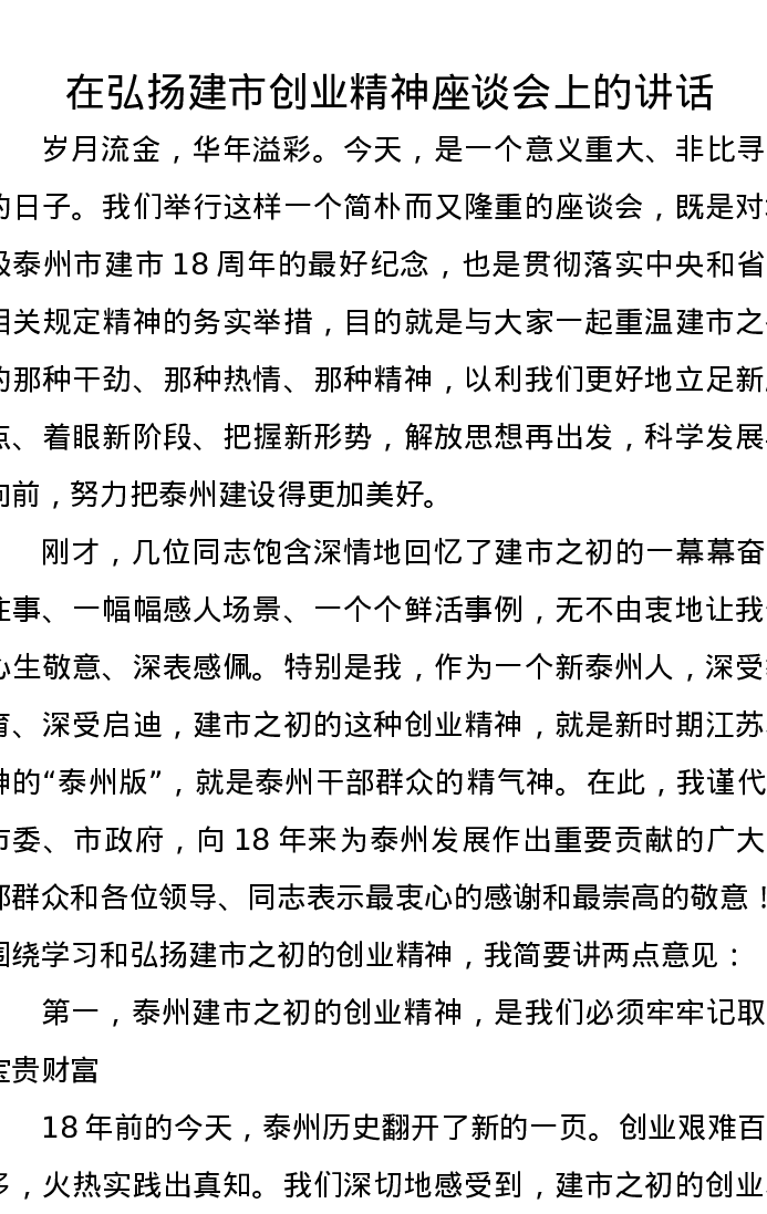 优选讲话:在弘扬建市创业精神座谈会上的讲话