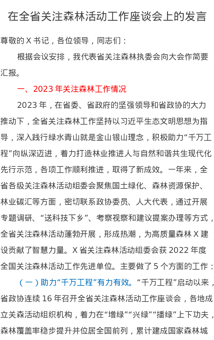 在全省关注森林活动工作座谈会上的发言