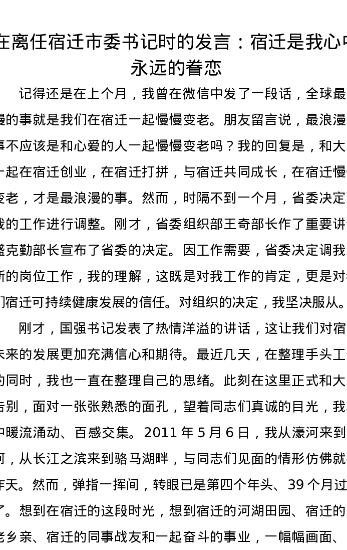 在离任宿迁市委书记时的发言:宿迁是我心中永远的眷恋