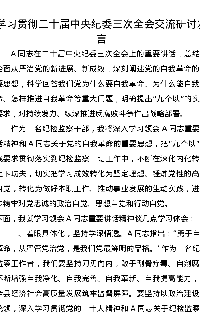 学习贯彻二十届中央纪委三次全会交流研讨发言