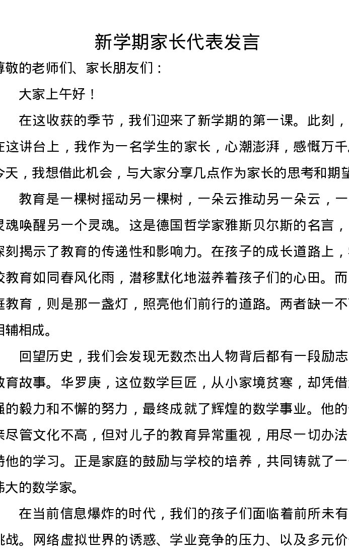 新学期家长代表发言