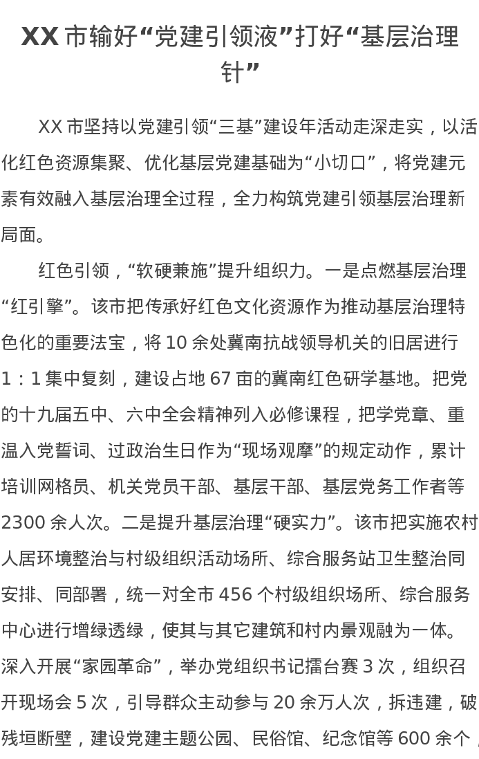 XX市输好“党建引领液”打好“基层治理针”汇报发言