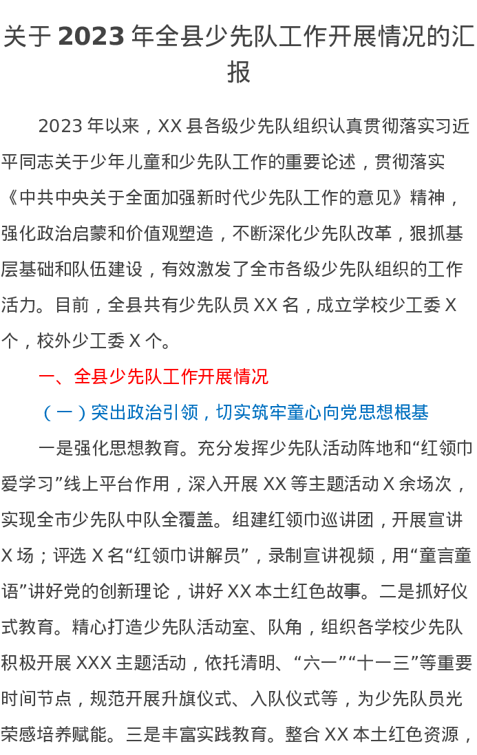 关于2023年全县少先队工作开展情况的汇报