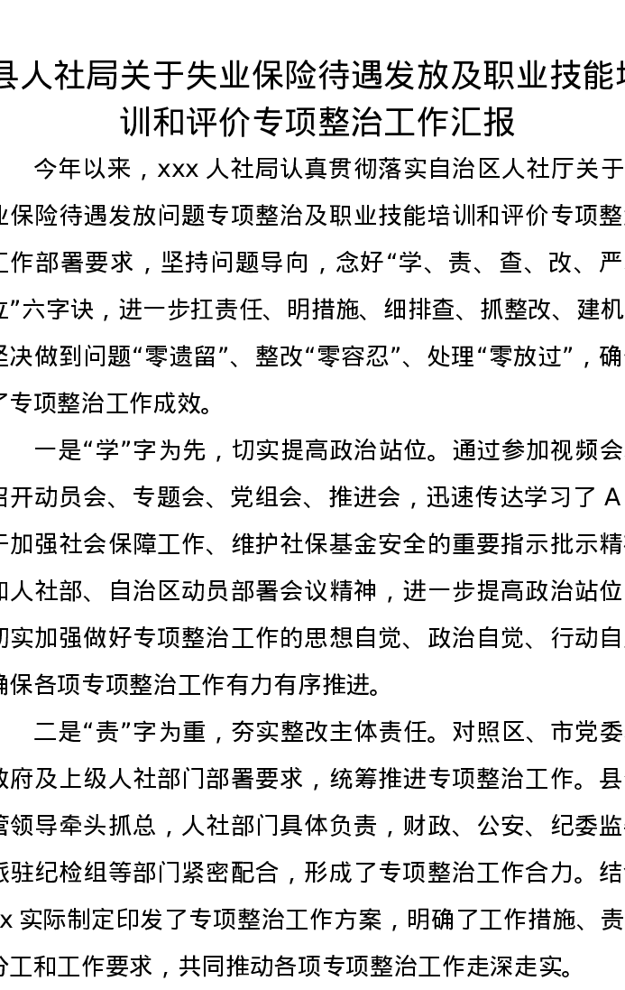 县人社局关于失业保险待遇发放及职业技能培训和评价专项整治工作汇报