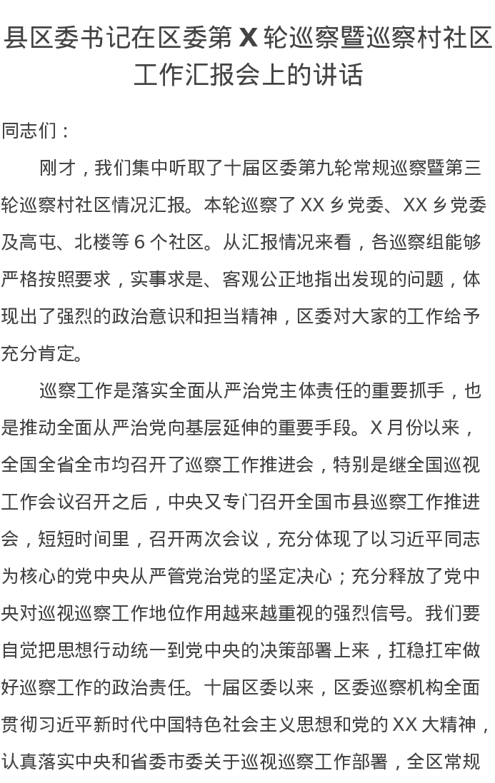 县区委书记在区委第X轮巡察暨巡察村社区工作汇报会上的讲话