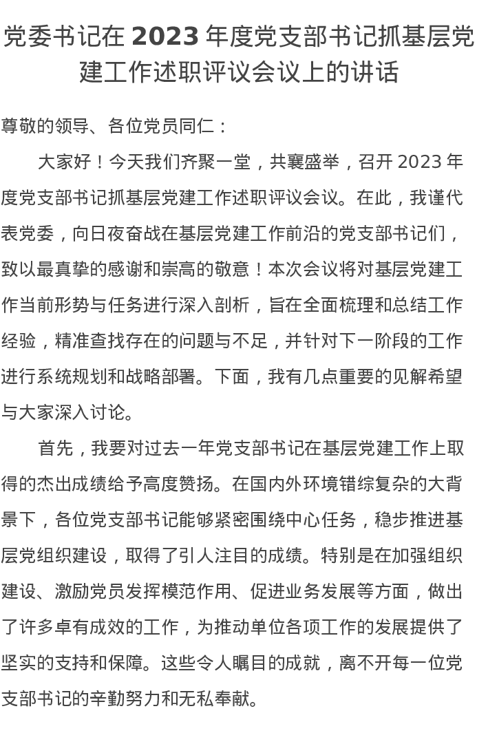 党委书记在2023年度党支部书记抓基层党建工作述职评议会议上的讲话